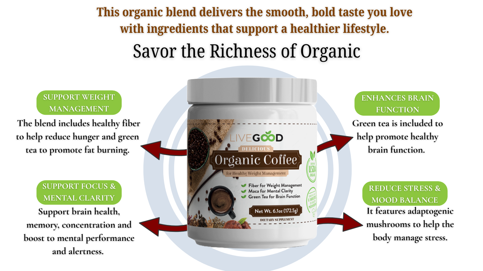 Start your day with more than just a cup of coffee—embrace a healthier lifestyle with LiveGood Organic Coffee. Infused with a blend of natural ingredients like green tea for enhanced brain function, maca roots for mental clarity, and organic acacia fiber for weight management and a blend of mushroom for stress relief and immune booster, this coffee does more than just wake you up. It's designed to support your overall well-being, helping you feel energized, focused, and ready to take on the day. From your first sip of our delicious blend, you'll feel the incredible benefits—and you might never want another coffee again!